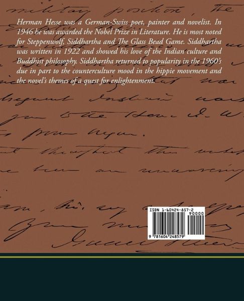 Herman Hesse was a German-Swiss poet, painter and novelist. In 1946 he was awarded the Nobel Prize in Literature. He is most noted for Steppenwolf, Siddhartha and The Glass Bead Game. Siddhartha was written in 1922 and showed his love of the Indian culture and Buddhist philosophy. Siddhartha returned to popularity in the 1960's due in part to the counterculture mood in the hippie movement and the novel's themes of a quest for enlightenment.