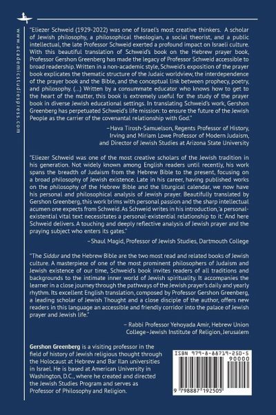 Translator's Acknowledgements Translator's Introduction: Eliezer Schweid as Worshipper in the State of Israel Author's Preface: My Path to the Jewish Prayer Book (Siddur Hatefillah) Introduction: The Siddur (Jewish Prayer Book): Its Sources, Goal, and Theological Basis 1. Worship of God and the Process of the Sacred Congregation's Formation and Expression 2. Prayer as a Form of Primal Expression of the Human Soul 3. Torah and Prayer: The Problem of Love and Sin in the Relations between God and the Human Being 4. The "Name and Kingship" Blessing as the Fundamental Rubric of Standing before God in Prayer 5. Establishing the Covenant of Faith between the Individual Human Being and His God 6. Principles of Faith 7. Keriyat Shema-Covenant of Love between God and His People 8. The Poetics of the Shema and the Shemoneh Esrei 9. The Shemoneh Esrei Prayer: The Kedushah (Sanctification) and ¿aninat Hada'at (God as Giver of Knowledge) 10. The Shemoneh Esrei Prayer-Requests by the Individual in the Assembly: Teshuvah (Repentance) and Forgiveness 11. The Shemoneh Esrei Prayer: Redemption, Healing, and Livelihood 12. The Shemoneh Esrei (Eighteen Benedictions) That Are Really Nineteen: Redemption from Deepening Exile 13. The Shemoneh Esrei-Responding in Anticipation of Complete Redemption 14. Types of Biblical Poetry as a Source of Prayer 15. Between the Poetry of Prophecy and Prayer 16. The Poetry of the Psalms: Personal-Soulful and Societal-Political Messages 17. Hymnal Song for the Sabbath Day. The "Sign" between God and His Treasured Nation and the Isolation from Christianity 18. Breaking the Boundary of Mystery between the Kingdom of Heaven and the Earth: Praying with Devekut (Adherence) and with Kavanah (Intention) Epilogue: The Universality and Perpetuity of Moving from Slavery to Freedom and from Exile to Redemption Glossary Index