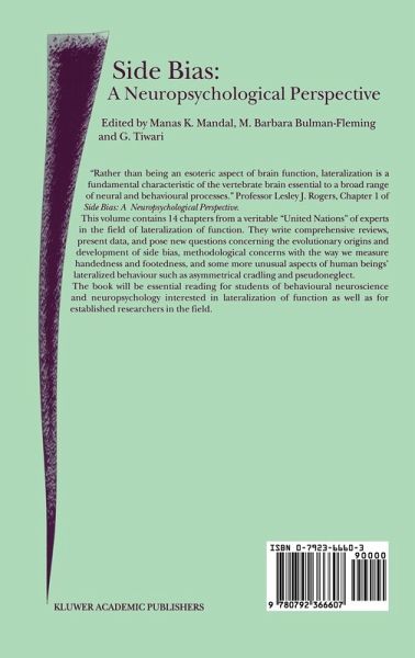 `Rather than being an esoteric aspect of brain function, lateralization is a fundamental characteristic of the vertebrate brain essential to a broad range of neural and behavioral processes.' Professor Lesley J. Rogers, Chapter 1 of Side Bias: A Neuropsychological Perspective. This volume contains 14 chapters from a veritable `United Nations' of experts in the field of lateralization of function. They write comprehensive reviews, present data, and pose new questions concerning the evolutionary origins and development of side bias, methodological concerns with the way we measure handedness and footedness, and some more unusual aspects of human beings' lateralized behavior, such as asymmetrical cradling and pseudoneglect. The book will be essential reading for students of behavioral neuroscience and neuropsychology interested in lateralization of function as well as for established researchers in the field.
