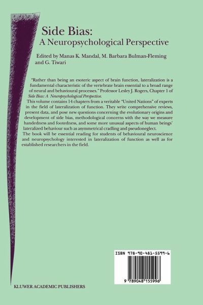 `Rather than being an esoteric aspect of brain function, lateralization is a fundamental characteristic of the vertebrate brain essential to a broad range of neural and behavioral processes.' Professor Lesley J. Rogers, Chapter 1 of Side Bias: A Neuropsychological Perspective. This volume contains 14 chapters from a veritable `United Nations' of experts in the field of lateralization of function. They write comprehensive reviews, present data, and pose new questions concerning the evolutionary origins and development of side bias, methodological concerns with the way we measure handedness and footedness, and some more unusual aspects of human beings' lateralized behavior, such as asymmetrical cradling and pseudoneglect. The book will be essential reading for students of behavioral neuroscience and neuropsychology interested in lateralization of function as well as for established researchers in the field.