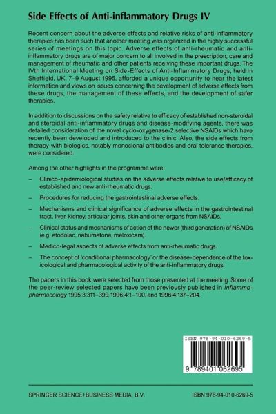 Recent concern about the adverse effects and relative risks of anti- inflammatory therapies has been such that another meeting was organized in the highly successful series of meetings on this topic. Adverse effects of anti-rheumatic and anti-inflammatory drugs are of major concern to all involved in the prescription, care and management of rheumatic and other patients receiving these important drugs. The IVth International Meeting on Side-Effects of Anti-Inflammatory Drugs, held in Sheffield, UK, 7-9 August 1995, afforded a unique opportunity to hear the latest information and views on issues concerning the development of adverse effects from these drugs, the management of these effects, and the development of safer therapies.