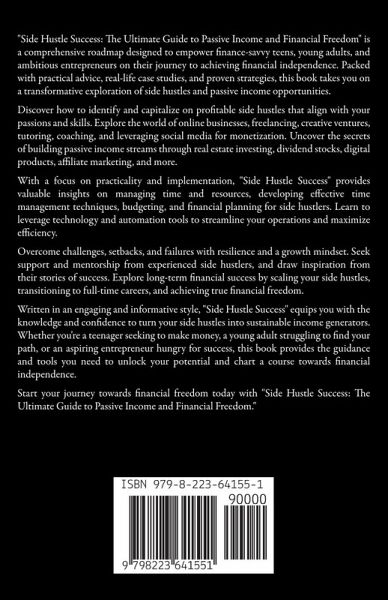 "Side Hustle Success: The Ultimate Guide to Passive Income and Financial Freedom" is a comprehensive roadmap designed to empower finance-savvy teens, young adults, and ambitious entrepreneurs on their journey to achieving financial independence. Packed with practical advice, real-life case studies, and proven strategies, this book takes you on a transformative exploration of side hustles and passive income opportunities. Discover how to identify and capitalize on profitable side hustles that align with your passions and skills. Explore the world of online businesses, freelancing, creative ventures, tutoring, coaching, and leveraging social media for monetization. Uncover the secrets of building passive income streams through real estate investing, dividend stocks, digital products, affiliate marketing, and more. With a focus on practicality and implementation, "Side Hustle Success" provides valuable insights on managing time and resources, developing effective time management techniques, budgeting, and financial planning for side hustlers. Learn to leverage technology and automation tools to streamline your operations and maximize efficiency. Overcome challenges, setbacks, and failures with resilience and a growth mindset. Seek support and mentorship from experienced side hustlers, and draw inspiration from their stories of success. Explore long-term financial success by scaling your side hustles, transitioning to full-time careers, and achieving true financial freedom. Written in an engaging and informative style, "Side Hustle Success" equips you with the knowledge and confidence to turn your side hustles into sustainable income generators. Whether you're a teenager seeking to make money, a young adult struggling to find your path, or an aspiring entrepreneur hungry for success, this book provides the guidance and tools you need to unlock your potential and chart a course towards financial independence. Start your journey towards financial freedom today with "Side Hustle Success: The Ultimate Guide to Passive Income and Financial Freedom."