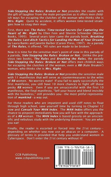 Side-Stepping the Rules: Broken or Not provides the reader with the gift of laughter from the male perspective as it offers men childish ways for escaping the clutches of the woman who thinks she is Mrs. Right. Quite by accident, it offers women time-tested strategies how to snag their man. First, there was The Rules: Time-tested Secrets for Capturing the Heart of Mr. Right by Ellen Fein and Sherrie Schneider (Warner Books, 1995). Several years later came the parody book, Breaking the Rules: Last-ditch Tactics for Landing the Man of Your Dreams by Laura Banks and Janette Barber (Career Press, 1997). As a parody of The Rules, it offered, "All rules are made to be broken." Now it is time for the sensitive man's point of view in this parody of a parody, Side-Stepping the Rules: Broken or Not. Unlike the previous two books, The Rules and Breaking the Rules, the parody Side-Stepping the Rules: Broken or Not offers men childish ways for escaping the clutches of the woman, even a RB (Rule Breakin') woman, who thinks she is Mrs. Right. Side-Stepping the Rules: Broken or Not provides the sensitive male with 11 manifestos that will serve as countermeasures to the wiles of RB women. No worries mate! If you fail to apply successfully the first manifesto, you still have 10 more chances to fight off those pesky RB women. Even if you are unsuccessful with the first 10 manifestos, the final manifesto, "Sell your house and blend invisibly with the homeless," still provides you-the most pitiful representation of mankind-a way out. For those readers who are inpatient and used cliff notes to float through high school, save yourself time by turning to Chapter 12 now and Consult Your MAN Index. The MAN Index offers you the chance to pinpoint immediately how you will fare with the approaches of a RB woman. The MAN Index is based grossly on an unscientific and nebulous study with the underlying theorem: You are what you eat! Finally, the reader is escorted or forced into the 21st century-depending on whether you now use an abacus or a computer. A glossary of terms is provided that help you understand women in Cyberspace. Don't enter the 21st century without it! About the Author: I began writing little stories for children of friends and relatives that included their personal data about their personal lives. This happened about 15 years before such books became popular commercially. It was these stories that formed the basis of my first children's book, Twelve Upon A Time ... I also wrote a mystery/adventure novel, Mirror, Mirror at 1600 D.C. This political intrigue novel gives you characters in believable relationships bound up in a mystery and an adventure that will keep you speculating throughout the book. After that serious effort, I took a light-hearted approach in this parody book, Side-Stepping the Rules: Broken or Not. This parody provides the reader with the gift of laughter from the male perspective as it offers men childish ways for escaping the clutches of the woman who thinks she is Mrs. Right. Side-Stepping the Rules: Broken or Not provides the sensitive male with 11 manifestos that will serve as countermeasures to the wiles of RB women. No worries mate! Even if you are unsuccessful with the first 10 manifestos, the final manifesto, "Sell your house and blend invisibly with the homeless," still provides you-the most pitiful representation of mankind-a way out. As with all my books, I hope the reader enjoys the read as much as I enjoyed the write.