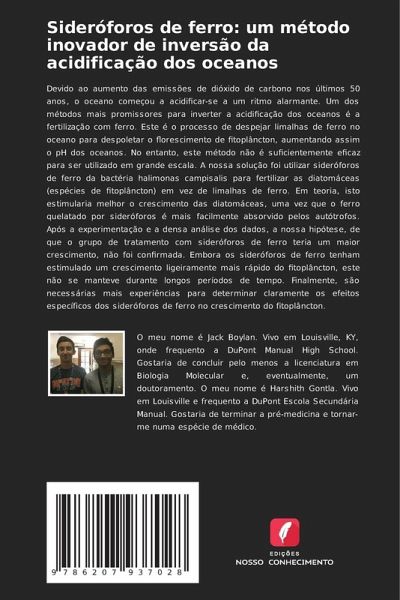 Devido ao aumento das emissões de dióxido de carbono nos últimos 50 anos, o oceano começou a acidificar-se a um ritmo alarmante. Um dos métodos mais promissores para inverter a acidificação dos oceanos é a fertilização com ferro. Este é o processo de despejar limalhas de ferro no oceano para despoletar o florescimento de fitoplâncton, aumentando assim o pH dos oceanos. No entanto, este método não é suficientemente eficaz para ser utilizado em grande escala. A nossa solução foi utilizar sideróforos de ferro da bactéria halimonas campisalis para fertilizar as diatomáceas (espécies de fitoplâncton) em vez de limalhas de ferro. Em teoria, isto estimularia melhor o crescimento das diatomáceas, uma vez que o ferro quelatado por sideróforos é mais facilmente absorvido pelos autótrofos. Após a experimentação e a densa análise dos dados, a nossa hipótese, de que o grupo de tratamento com sideróforos de ferro teria um maior crescimento, não foi confirmada. Embora os sideróforos de ferro tenham estimulado um crescimento ligeiramente mais rápido do fitoplâncton, este não se manteve durante longos períodos de tempo. Finalmente, são necessárias mais experiências para determinar claramente os efeitos específicos dos sideróforos de ferro no crescimento do fitoplâncton.