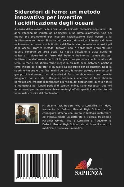 A causa dell'aumento delle emissioni di anidride carbonica negli ultimi 50 anni, l'oceano ha iniziato ad acidificarsi a un ritmo allarmante. Uno dei metodi più promettenti per invertire l'acidificazione degli oceani è la fertilizzazione con ferro. Si tratta del processo di scarico di limatura di ferro nell'oceano per innescare la fioritura del fitoplancton, aumentando così il pH degli oceani. Questo metodo, tuttavia, non è abbastanza efficiente per essere condotto su larga scala. La nostra soluzione è stata quella di utilizzare i siderofori di ferro del batterio halimonas campisalis per fertilizzare le diatomee (specie di fitoplancton) piuttosto che le limature di ferro. In teoria, ciò stimolerebbe meglio la crescita delle diatomee, poiché il ferro chelato dai siderofori è più facile da assorbire per gli autotrofi. Dopo la sperimentazione e una fitta analisi dei dati, la nostra ipotesi, secondo cui il gruppo di trattamento con siderofori di ferro avrebbe avuto una crescita maggiore, non è stata suffragata. Sebbene i siderofori di ferro abbiano stimolato una crescita leggermente più rapida del fitoplancton, questa non si è mantenuta per lunghi periodi di tempo. Infine, sono necessari ulteriori esperimenti per determinare chiaramente gli effetti specifici dei siderofori di ferro sulla crescita del fitoplancton.