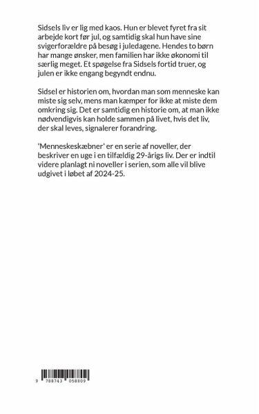 Sidsels liv er lig med kaos. Hun er blevet fyret fra sit arbejde kort før jul, og samtidig skal hun have sine svigerforældre på besøg i juledagene. Hendes to børn har mange ønsker, men familien har ikke økonomi til særlig meget. Et spøgelse fra Sidsels fortid truer, og julen er ikke engang begyndt endnu. Sidsel er historien om, hvordan man som menneske kan miste sig selv, mens man kæmper for ikke at miste dem omkring sig. Det er samtidig en historie om, at man ikke nødvendigvis kan holde sammen på livet, hvis det liv, der skal leves, signalerer forandring. 'Menneskeskæbner' er en serie af noveller, der beskriver en uge i en tilfældig 29-årigs liv. Der er indtil videre planlagt ni noveller i serien, som alle vil blive udgivet i løbet af 2024-25.
