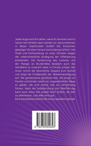 Jedes Auge wird Ihn sehen, wenn Er kommen wird in Seiner Herrlichkeit; aber werden wir Jesus erkennen in dieser machtvollen Größe? Die Antworten gläubiger Christen hierauf sind widersprüchlich. Viel Streit und Entfremdung ist unter Christen wegen der unterschiedlichen Auslegung der Offenbarung entstanden. Die Verkennung des Lammes und der Mangel an Bruderliebe belasten auch das Verhältnis zu unserem Vater in Christo schwer. Der Autor nimmt die Geschichte Josephs zum Vorbild und zeigt die Problematik der Wiedervereinigung auf. Die gemeinsame geistliche Not, die Sorge um Familie und Kinder, treibt sie, ungewöhnliche Wege zu gehen, die zum Sohne und zur Versöhnung führen. Nach der Selbstprüfung und Überführung kann auch Jesus wie Joseph nicht anders, als Sich zu offenbaren, und alles wird gut.Eine dramatische Geschichte wird prophetisch aktuell.