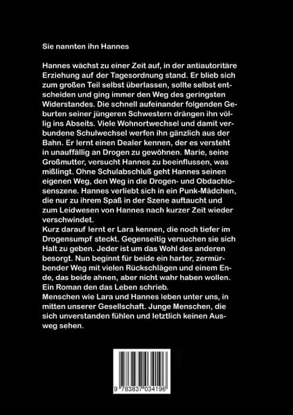 "Sie nannten ihn Hannes"Hannes wächst zu einer Zeit auf, in der antiautoritäre Erziehung auf der Tagesordnung stand. Er blieb sich zum großen Teil selbst überlassen, sollte immer selbst entscheiden und ging immer den Weg des geringsten Widerstandes. Die schnell aufeinander folgenden Geburten seiner jüngeren Schwestern drängen ihn völlig ins Abseits. Viele Wohnortwechsel und damit verbundene Schulwechsel werfen ihn gänzlich aus der Bahn. Er lernt einen Dealer kennen, der es versteht in unauffällig an Drogen zu gewöhnen. Marie, seine Großmutter, versucht Hannes zu beeinflussen, was misslingt. Ohne Schulabschluss geht Hannes seinen eigenen Weg, den Weg in die Drogen- und Obdachlosenszene. Hannes verliebt sich in Pinki, die in der Szene auftaucht, jedoch nur zum Spaß und wieder verschwindet.Kurz darauf lernt er Lara kennen, die noch tiefer im Drogensumpf steckt als er. Gegenseitig versuchen sie sich Halt zu geben. Jeder ist um das Wohl des anderen besorgt. Nun beginnt für beide ein harter, zermürbender Weg mit vielen Rückschlägen und einem Ende, das beide ahnen, aber nicht wahr haben wollen.Ein Roman den das Leben schrieb. Lara und Hannes leben unter uns, in mitten unserer Gesellschaft. Junge Menschen, die sich unverstanden fühlen und letztlich keine Ausweg sehen.