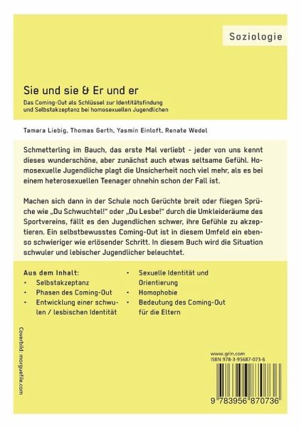 Fachbuch aus dem Jahr 2013 im Fachbereich Soziologie - Familie, Frauen, Männer, Sexualität, Geschlechter, , Sprache: Deutsch, Abstract: Schmetterling im Bauch, das erste Mal verliebt - jeder von uns kennt dieses wunderschöne, aber zunächst auch etwas seltsame Gefühl. Homosexuelle Jugendliche plagt die Unsicherheit noch viel mehr, als es bei einem heterosexuellen Teenager ohnehin schon der Fall ist.Machen sich dann in der Schule noch Gerüchte breit oder fliegen Sprüche wie "Du Schwuchtel!" oder "Du Lesbe!" durch die Umkleideräume des Sportvereins, fällt es den Jugendlichen schwer, ihre Gefühle zu akzeptieren. Ein selbstbewusstes Coming-Out ist in diesem Umfeld ein ebenso schwieriger wie erlösender Schritt. In diesem Buch wird die Situation schwuler und lebischer Jugendlicher beleuchtet.Aus dem Inhalt:SelbstakzeptanzPhasen des Coming-OutEntwicklung einer schwulen / lesbischen IdentitätSexuelle Identität und OrientierungHomophobieBedeutung des Coming-Out für die Eltern