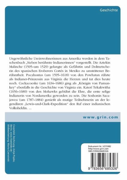 Fachbuch aus dem Jahr 2014 im Fachbereich Geschichte - Amerika, , Sprache: Deutsch, Abstract: Ungewöhnliche Ureinwohnerinnen aus Amerika werden in dem Taschenbuch "Sieben berühmte Indianerinnen" vorgestellt. Die Aztekin Malinche (1505-um 1529) gelangte als Gefährtin und Dolmetscherin des spanischen Eroberers Cortés in Mexiko zu umstrittener Berühmtheit. Pocahontas (um 1595-1618) von den Powhatan rührte als Indianer-Prinzessin aus Virginia die Herzen und tut dies heute noch. Cockacoeske (um 1634-1686) ging als "Königin von Pamunkey" ebenfalls in die Geschichte von Virginia ein. Katerí Tekakwitha (1656-1680) von den Mohawks gebührt die Ehre, die erste selige Indianerin von Nordamerika geworden zu sein. Die Soshonin Sacajawea (um 1787-1884) genießt als mutige Teilnehmerin an der legendären "Lewis-und-Clark-Expedition" den Ruf einer indianischen Volksheldin. Die 1809 geborene Mohongo, Ehefrau eines Osage-Häuptlings von den westlichen Sioux, erlebte als Tänzerin in Europa eine schwereZeit. Die Apachin Lozen (1825-1880) tat sich bei den erbitterten Kämpfen ihres Bruders Victorio gegen die Weißen als tapfere Kriegerin, weise Seherin und tüchtige Medizinfrau hervor. Verfasser des Taschenbuches "Sieben berühmte Indianerinnen" ist der Wiesbadener Autor Ernst Probst. Eine von dessenSpezialitäten sind Biografien über berühmte Frauen.