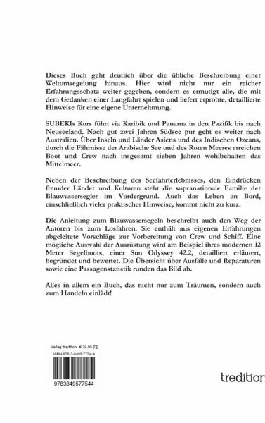 Der erste Buchteil, der Reisebericht einer Weltumsegelung 1999 bis 2011 basiert auf dem Logbuch der Segelyacht SUBEKI (https://subeki.de). Ihr Kurs führt via Karibik und Panama in den Pazifik bis nach Neuseeland. Nach gut zwei Jahren Südsee pur geht es weiter nach Australien. Über Inseln und Länder Asiens und des Indischen Ozeans, durch die Fährnisse der Arabische See und des Roten Meeres erreichen Boot und Crew nach insgesamt sieben Jahren wohlbehalten das Mittelmeer und nach weiteren fünf Jahren den Heimathafen. Der Reisebericht, aus der Feder von Sybille Uehr, beschreibt Menschen, Orte, Ereignisse und Gefühle, Pech und Glück, Erkenntnisse und Erfahrungen, Fehler, Lust und Last, kurzum sieben Jahre pralles Blauwasserleben. Neben der Beschreibung des Seefahrterlebnisses, den Eindrücken fremder Länder und Kulturen steht die supranationale Familie der Blauwassersegler im Vordergrund. Auch das Leben an Bord, einschließlich vieler praktischer Hinweise, kommt nicht zu kurz. Im zweiten Teil des Buches ergänzt Christian Uehr den Reisebericht für diejenigen, die mit der Idee spielen, eine Weltumsegelung oder eine Langfahrt in außereuropäische Gewässer zu unternehmen oder auch nur alles ganz genau wissen wollen. Er greift die Fragen auf, die sich die beiden vor dem Losfahren gestellt und Probleme oder Sachverhalte, mit denen sie sich während ihrer Reise auseinandergesetzt haben. Dabei reflektiert er die Ausrüstung des Bootes und warum sich diese im Laufe der Zeit verändert hat. Für den aufmerksamen Leser werden sich naturgemäß Überschneidungen mit dem Erlebnisteil ergeben. Diese sind gewollt. Sie unterstreichen die Wichtigkeit, die die Autoren einem Sachverhalt zu messen. Die Anleitung zum Blauwassersegeln beschreibt auch den Weg der Autoren bis zum Losfahren. Sie enthält aus eigenen Erfahrungen abgeleitete Vorschläge zur Vorbereitung von Crew und Schiff. Eine mögliche Ausrüstungsausstattung wird am Beispiel ihres modernen 12 Meter Segelboots, einer Sun Odyssey 42.2, detailliert erläutert, begründet und bewertet. Eine Übersicht über Ausfälle und Reparaturen sowie eine Passagenstatistik runden das Bild ab. Kurzum, die Autoren haben versucht, ein Buch zu machen, das sie gerne für ihre Vorbereitung gehabt hätten und das alle Segler, die von einer Weltumsegelung träumen, ermuntern soll. Alles in allem ein Buch, das nicht nur zum Träumen, sondern auch zum Handeln einlädt!