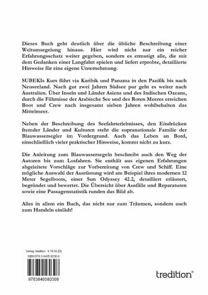 Der erste Buchteil, der Reisebericht einer Weltumsegelung 1999 bis 2011 basiert auf dem Logbuch der Segelyacht SUBEKI (https://subeki.de). Ihr Kurs führt via Karibik und Panama in den Pazifik bis nach Neuseeland. Nach gut zwei Jahren Südsee pur geht es weiter nach Australien. Über Inseln und Länder Asiens und des Indischen Ozeans, durch die Fährnisse der Arabische See und des Roten Meeres erreichen Boot und Crew nach insgesamt sieben Jahren wohlbehalten das Mittelmeer und nach weiteren fünf Jahren den Heimathafen. Der Reisebericht, aus der Feder von Sybille Uehr, beschreibt Menschen, Orte, Ereignisse und Gefühle, Pech und Glück, Erkenntnisse und Erfahrungen, Fehler, Lust und Last, kurzum sieben Jahre pralles Blauwasserleben. Neben der Beschreibung des Seefahrterlebnisses, den Eindrücken fremder Länder und Kulturen steht die supranationale Familie der Blauwassersegler im Vordergrund. Auch das Leben an Bord, einschließlich vieler praktischer Hinweise, kommt nicht zu kurz. Im zweiten Teil des Buches ergänzt Christian Uehr den Reisebericht für diejenigen, die mit der Idee spielen, eine Weltumsegelung oder eine Langfahrt in außereuropäische Gewässer zu unternehmen oder auch nur alles ganz genau wissen wollen. Er greift die Fragen auf, die sich die beiden vor dem Losfahren gestellt und Probleme oder Sachverhalte, mit denen sie sich während ihrer Reise auseinandergesetzt haben. Dabei reflektiert er die Ausrüstung des Bootes und warum sich diese im Laufe der Zeit verändert hat. Für den aufmerksamen Leser werden sich naturgemäß Überschneidungen mit dem Erlebnisteil ergeben. Diese sind gewollt. Sie unterstreichen die Wichtigkeit, die die Autoren einem Sachverhalt zu messen. Die Anleitung zum Blauwassersegeln beschreibt auch den Weg der Autoren bis zum Losfahren. Sie enthält aus eigenen Erfahrungen abgeleitete Vorschläge zur Vorbereitung von Crew und Schiff. Eine mögliche Ausrüstungsausstattung wird am Beispiel ihres modernen 12 Meter Segelboots, einer Sun Odyssey 42.2, detailliert erläutert, begründet und bewertet. Eine Übersicht über Ausfälle und Reparaturen sowie eine Passagenstatistik runden das Bild ab. Kurzum, die Autoren haben versucht, ein Buch zu machen, das sie gerne für ihre Vorbereitung gehabt hätten und das alle Segler, die von einer Weltumsegelung träumen, ermuntern soll. Alles in allem ein Buch, das nicht nur zum Träumen, sondern auch zum Handeln einlädt!