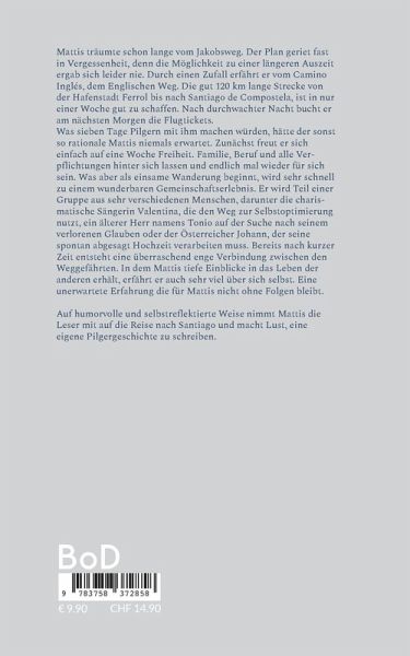 Mattis träumte schon lange vom Jakobsweg. Der Plan geriet fastin Vergessenheit, denn die Möglichkeit zu einer längeren Auszeitergab sich leider nie. Durch einen Zufall erfährt er vom CaminoInglés, dem Englischen Weg. Die gut 120 km lange Strecke vonder Hafenstadt Ferrol bis nach Santiago de Compostela, ist in nureiner Woche gut zu schaffen. Nach durchwachter Nacht bucht eram nächsten Morgen die Flugtickets.Was sieben Tage Pilgern mit ihm machen würden, hätte der sonstso rationale Mattis niemals erwartet. Zunächst freut er sicheinfach auf eine Woche Freiheit. Familie, Beruf und alle Verpflichtungen hinter sich lassen und endlich mal wieder für sichsein. Was aber als einsame Wanderung beginnt, wird sehr schnellzu einem wunderbaren Gemeinschaftserlebnis. Er wird Teil einerGruppe aus sehr verschiedenen Menschen, darunter die charismatische Sängerin Valentina, die den Weg zur Selbstoptimierung nutzt, ein älterer Herr namens Tonio auf der Suche nach seinem verlorenen Glauben oder der Österreicher Johann, der seine spontan abgesagt Hochzeit verarbeiten muss. Bereits nach kurzer Zeit entsteht eine überraschend enge Verbindung zwischen den Weggefährten. In dem Mattis tiefe Einblicke in das Leben der anderen erhält, erfährt er auch sehr viel über sich selbst. Eine unerwartete Erfahrung die für ihn nicht ohne Folgen bleibt.Auf humorvolle und selbstreflektierte Weise nimmt Mattis dieLeser mit auf die Reise nach Santiago und macht Lust, eineeigene Pilgergeschichte zu schreiben.