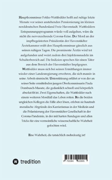 Hauptkommissar Fokko Wattfedder hofft auf ruhige letzte Monate vor seiner anstehenden Pensionierung im kleinen norddeutschen Bundesland Freie Havenstadt. Wattfedders Entspannungsprogramm würde voll aufgehen, wäre da nicht die nervenzehrende Corona-Krise. Der Mord an der impfbegeisterten Präsidentin der Havenstädter Ärztekammer reißt den Hauptkommissar gänzlich aus seinen ruhigen Tagen. Die prominente Ärztin wird tot aufgefunden und weist zudem drei Injektionsnadeln im Schulterbereich auf. Die Indizien sprechen für einen Täter aus dem Bereich der Havenstädter Impfgegner. Wattfedder muss sich bei seinen Ermittlungen immer wieder einer Landesregierung erwehren, die sich massiv in seine Arbeit einmischt. Unterstützung erfährt er von der an seiner Seite ermittelnden jungen Oberkommissarin Paula Dombusch-Maoate, die gedanklich schnell und körperlich absolut fit ist. Zwei Eigenschaften, die Wattfedder nach einem weiteren Mordfall das Leben retten. Bis die beiden ungleichen Kollegen die Fälle aber lösen, erleben sie hautnah moralische Abgründe des Karrierismus in der Medizin und die Polarisierung der Havenstädter Gesellschaft in der Corona-Pandemie, in der mit harten Bandagen und allen Tricks für eine vermeintliche wissenschaftliche Wahrheit gefochten wird.Eine Wahrheit, die tatsächlich mehrdeutig ist!
