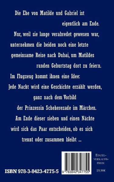 Die Ehe von Matilde und Gabriel ist eigentlich am Ende. Nur, weil sie lange verabredet gewesen war, unternehmen die beiden noch eine letzte gemeinsame Reise nach Dubai, um Matildes runden Geburtstag dort zu feiern. Im Flugzeug kommt ihnen eine Idee: Jede Nacht wird eine Geschichte erzählt werden, ganz nach dem Vorbild der Prinzessin Scheherezade im Märchen. Am Ende dieser sieben und einen Nächte wird sich das Paar entscheiden, ob es sich trennt oder zusammen bleibt ...