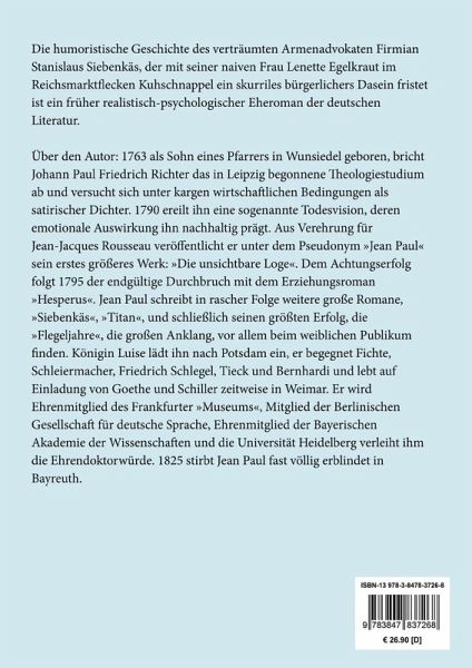 Jean Paul: Siebenkäs. Blumen-, Frucht- und Dornenstücke oder Ehestand, Tod und Hochzeit des Armenadvokaten F. St. Siebenkäs Lesefreundlicher Großdruck in 16-pt-Schrift Die humoristische Geschichte des verträumten Armenadvokaten Firmian Stanislaus Siebenkäs, der mit seiner naiven Frau Lenette Egelkraut im Reichsmarktflecken Kuhschnappel ein skurriles bürgerlichers Dasein fristet ist ein früher realistisch-psychologischer Eheroman der deutschen Literatur. Großformat, 210 x 297 mm Berliner Ausgabe, 2019 Durchgesehener Neusatz mit einer Biographie des Autors bearbeitet und eingerichtet von Theodor Borken Erstdruck: Berlin 1796/97. (3 Bde.). Textgrundlage ist die Ausgabe: Jean Paul: Werke. Herausgegeben von Norbert Miller und Gustav Lohmann, Band 1¿6, Band 2, München: Hanser, 1959¿1963. Umschlaggestaltung von Thomas Schultz-Overhage unter Verwendung des Bildes: Honoré Daumier, Lesender Advokat, Mitte des 19. Jahrhunderts. Gesetzt aus der Minion Pro, 16 pt. Henricus Edition Deutsche Klassik UG (haftungsbeschränkt) Über den Autor: 1763 als Sohn eines Pfarrers in Wunsiedel geboren, bricht Johann Paul Friedrich Richter das in Leipzig begonnene Theologiestudium ab und versucht sich unter kargen wirtschaftlichen Bedingungen als satirischer Dichter. 1790 ereilt ihn eine sogenannte Todesvision, deren emotionale Auswirkung ihn nachhaltig prägt. Aus Verehrung für Jean-Jacques Rousseau veröffentlicht er unter dem Pseudonym »Jean Paul« sein erstes größeres Werk: »Die unsichtbare Loge«. Dem Achtungserfolg folgt 1795 der endgültige Durchbruch mit dem Erziehungsroman »Hesperus«. Jean Paul schreibt in rascher Folge weitere große Romane, »Siebenkäs«, »Titan«, und schließlich seinen größten Erfolg, die »Flegeljahre«, die großen Anklang, vor allem beim weiblichen Publikum finden. Königin Luise lädt ihn nach Potsdam ein, er begegnet Fichte, Schleiermacher, Friedrich Schlegel, Tieck und Bernhardi und lebt auf Einladung von Goethe und Schiller zeitweise in Weimar. Er wird Ehrenmitglied des Frankfurter »Museums«, Mitglied der Berlinischen Gesellschaft für deutsche Sprache, Ehrenmitglied der Bayerischen Akademie der Wissenschaften und die Universität Heidelberg verleiht ihm die Ehrendoktorwürde. 1825 stirbt Jean Paul fast völlig erblindet in Bayreuth.