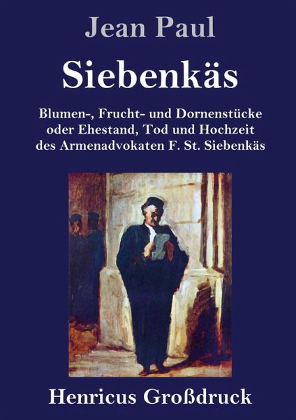Jean Paul: Siebenkäs. Blumen-, Frucht- und Dornenstücke oder Ehestand, Tod und Hochzeit des Armenadvokaten F. St. Siebenkäs Lesefreundlicher Großdruck in 16-pt-Schrift Die humoristische Geschichte des verträumten Armenadvokaten Firmian Stanislaus Siebenkäs, der mit seiner naiven Frau Lenette Egelkraut im Reichsmarktflecken Kuhschnappel ein skurriles bürgerlichers Dasein fristet ist ein früher realistisch-psychologischer Eheroman der deutschen Literatur. Großformat, 210 x 297 mm Berliner Ausgabe, 2019 Durchgesehener Neusatz mit einer Biographie des Autors bearbeitet und eingerichtet von Theodor Borken Erstdruck: Berlin 1796/97. (3 Bde.). Textgrundlage ist die Ausgabe: Jean Paul: Werke. Herausgegeben von Norbert Miller und Gustav Lohmann, Band 1¿6, Band 2, München: Hanser, 1959¿1963. Umschlaggestaltung von Thomas Schultz-Overhage unter Verwendung des Bildes: Honoré Daumier, Lesender Advokat, Mitte des 19. Jahrhunderts. Gesetzt aus der Minion Pro, 16 pt. Über den Autor: 1763 als Sohn eines Pfarrers in Wunsiedel geboren, bricht Johann Paul Friedrich Richter das in Leipzig begonnene Theologiestudium ab und versucht sich unter kargen wirtschaftlichen Bedingungen als satirischer Dichter. 1790 ereilt ihn eine sogenannte Todesvision, deren emotionale Auswirkung ihn nachhaltig prägt. Aus Verehrung für Jean-Jacques Rousseau veröffentlicht er unter dem Pseudonym »Jean Paul« sein erstes größeres Werk: »Die unsichtbare Loge«. Dem Achtungserfolg folgt 1795 der endgültige Durchbruch mit dem Erziehungsroman »Hesperus«. Jean Paul schreibt in rascher Folge weitere große Romane, »Siebenkäs«, »Titan«, und schließlich seinen größten Erfolg, die »Flegeljahre«, die großen Anklang, vor allem beim weiblichen Publikum finden. Königin Luise lädt ihn nach Potsdam ein, er begegnet Fichte, Schleiermacher, Friedrich Schlegel, Tieck und Bernhardi und lebt auf Einladung von Goethe und Schiller zeitweise in Weimar. Er wird Ehrenmitglied des Frankfurter »Museums«, Mitglied der Berlinischen Gesellschaft für deutsche Sprache, Ehrenmitglied der Bayerischen Akademie der Wissenschaften und die Universität Heidelberg verleiht ihm die Ehrendoktorwürde. 1825 stirbt Jean Paul fast völlig erblindet in Bayreuth.