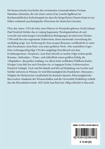 Die humoristische Geschichte des verträumten Armenadvokaten Firmian Stanislaus Siebenkäs, der mit seiner naiven Frau Lenette Egelkraut im Reichsmarktflecken Kuhschnappel ein skurriles bürgerlichers Dasein fristet ist ein früher realistisch-psychologischer Eheroman der deutschen Literatur.