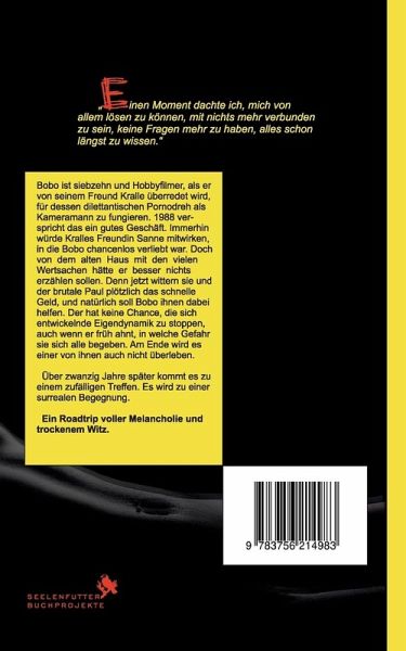 "Ich war ihr so nah, aber sie merkte nichts davon. Ich vergrub meine Nase und meinen Mund, meine Sinne, mein Denken, mein ganzes bisschen Dasein in ihrem Haar. Ich versteckte mich darin, machte mich klein, stahl mich davon. Einen Moment dachte ich, mich von allem lösen zu können, mit nichts mehr verbunden zu sein, keine Fragen mehr zu haben, alles schon längst zu wissen. Einen Moment lang schien dieser Wagen zu schweben."Bobo ist siebzehn und Hobbyfilmer, als er von seinem Freund Kralle überredet wird, für dessen dilettantischen Pornodreh als Kameramann zu fungieren. 1988 verspricht das ein gutes Geschäft. Immerhin würde Kralles Freundin Sanne mitwirken, in die Bobo chancenlos verliebt war. Doch von dem alten Haus mit den vielen Wertsachen hätte er besser nichts erzählen sollen. Denn jetzt wittern sie und der brutale Paul plötzlich das schnelle Geld, und natürlich soll Bobo ihnen dabei helfen. Der hat keine Chance, die sich entwickelnde Eigendynamik zu stoppen, auch wenn er früh ahnt, in welche Gefahr sie sich alle begeben. Am Ende wird es einer von ihnen auch nicht überleben.Über zwanzig Jahre später kommt es zu einem zufälligen Treffen. Es wird zu einer surrealen Begegnung.Ein Roadtrip voller Melancholie und trockenem Witz.
