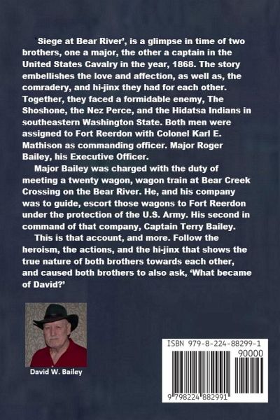 'Siege at Bear River', is a glimpse in time of two brothers, one a major, the other a captain in the United States Cavalry in the year, 1868. The story embellishes the love and affection, as well as, the comradery, and hi-jinx they had for each other. Together, they faced a formidable enemy, The Shoshone, the Nez Perce, and the Hidatsa Indians in southeastern Washington State. Both men were assigned to Fort Reerdon with Colonel Karl E. Mathison as commanding officer. Major Roger Bailey, his Executive Officer. Major Bailey was charged with the duty of meeting a twenty wagon, wagon train at Bear Creek Crossing on the Bear River. He, and his company was to guide, escort those wagons to Fort Reerdon under the protection of the U.S. Army. His second in command of that company, Captain Terry Bailey. This is that account, and more. Follow the heroism, the actions, and the hi-jinx that shows the true nature of both brothers towards each other, and caused both brothers to also ask, 'What became of David?'