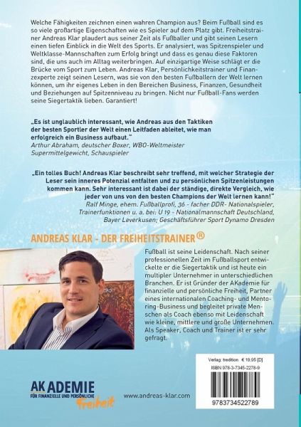 Andreas Klar, ehemaliger Fußballer, beschreibt auf einzigartige Weise, dass Menschen wie Du und ich von den Erfolgsstrategien der besten Fußballer und Mannschaften der Welt lernen können. Er analysiert Trainingsmethoden, Einstellungen, Charakterzüge der Spitzensportler und überträgt die Essenz auf leicht verständliche Weise in praktische Tipps für die Lebensbereiche Business, Karriere, Persönlichkeitsentwicklung, Gesundheit, Fitness und Beziehungen. Das Buch ist ein Ratgeber, der inspiriert und dazu motiviert, aus seinem Leben mehr zu machen und die universellen Lebensgesetze zur Veränderung in ein glücklicheres und erfolgreicheres Leben in finanzieller und persönlicher Freiheit zu nutzen.