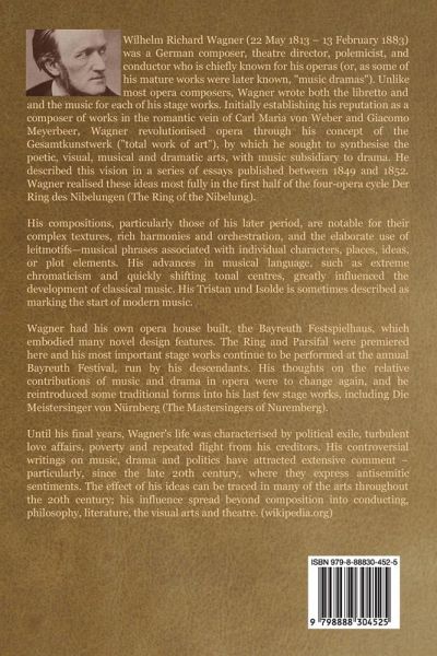 Götterdämmerung (Twilight of the Gods), is the last in Richard Wagner's cycle of four music dramas titled Der Ring des Nibelungen (The Ring of the Nibelung, or The Ring Cycle or The Ring for short). It received its premiere at the Bayreuth Festspielhaus on 17 August 1876, as part of the first complete performance of the whole work. The title is a translation into German of the Old Norse phrase Ragnarök, which in Norse mythology refers to a prophesied war among various beings and gods that ultimately results in the burning, immersion in water, and renewal of the world. As with the rest of the Ring, however, Wagner's account diverges significantly from these Old Norse sources. (wikipedia.org) About the author Wilhelm Richard Wagner (22 May 1813 - 13 February 1883) was a German composer, theatre director, polemicist, and conductor who is chiefly known for his operas (or, as some of his mature works were later known, "music dramas"). Unlike most opera composers, Wagner wrote both the libretto and the music for each of his stage works. Initially establishing his reputation as a composer of works in the romantic vein of Carl Maria von Weber and Giacomo Meyerbeer, Wagner revolutionised opera through his concept of the Gesamtkunstwerk ("total work of art"), by which he sought to synthesise the poetic, visual, musical and dramatic arts, with music subsidiary to drama. He described this vision in a series of essays published between 1849 and 1852. Wagner realised these ideas most fully in the first half of the four-opera cycle Der Ring des Nibelungen (The Ring of the Nibelung). His compositions, particularly those of his later period, are notable for their complex textures, rich harmonies and orchestration, and the elaborate use of leitmotifs-musical phrases associated with individual characters, places, ideas, or plot elements. His advances in musical language, such as extreme chromaticism and quickly shifting tonal centres, greatly influenced the development of classical music. His Tristan und Isolde is sometimes described as marking the start of modern music. Wagner had his own opera house built, the Bayreuth Festspielhaus, which embodied many novel design features. The Ring and Parsifal were premiered here and his most important stage works continue to be performed at the annual Bayreuth Festival, run by his descendants. His thoughts on the relative contributions of music and drama in opera were to change again, and he reintroduced some traditional forms into his last few stage works, including Die Meistersinger von Nürnberg (The Mastersingers of Nuremberg). Until his final years, Wagner's life was characterised by political exile, turbulent love affairs, poverty and repeated flight from his creditors. His controversial writings on music, drama and politics have attracted extensive comment - particularly, since the late 20th century, where they express antisemitic sentiments. The effect of his ideas can be traced in many of the arts throughout the 20th century; his influence spread beyond composition into conducting, philosophy, literature, the visual arts and theatre. (wikipedia.org)