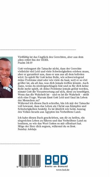 Vielfältig ist das Unglück des Gerechten, aber aus dem allen rettet ihn der HERR.Psalm 34:19Gott verleugnet die Tatsache nicht, dass der Gerechte vielleicht viel Leid und viele Schwierigkeiten erleben muss, aber er garantiert uns, dass er uns aus all dem befreien wird. Es spielt für Gott keine Rolle, wie schwerwiegend deine Probleme sind oder wie viele du hast, weil er so viel größer ist, als all das, was dich jemals treffen könnte. Auch dann, wenn du niedergeschlagen bist und es für dich keine Rolle mehr spielt, ob deine Probleme jemals gelöst werden, nimmt Gott die Verantwortung auf sich, diese zu beseitigen. Wenn das die Wahrheit ist - und es ist die Wahrheit - stellt sich eine Frage. Warum lässt Gott Leid und Qual im Leben der Menschen zu?Während ich dieses Buch schreibe, bin ich mir der Tatsache voll bewusst, dass das Leben als Christ aus Kämpfen und Schwierigkeiten besteht. Es ist ähnlich wie beim Auszug des Volkes Israels aus Ägypten ins Verheißene Land.Ich habe dieses Buch geschrieben, um dir zu helfen, ein siegreiches Leben zu führen und das Verheißene Land zu besitzen, so wie das Wort Gottes es mir offenbart hat. Möge der Herr dich segnen, während du es liest.Sunday Adelaja