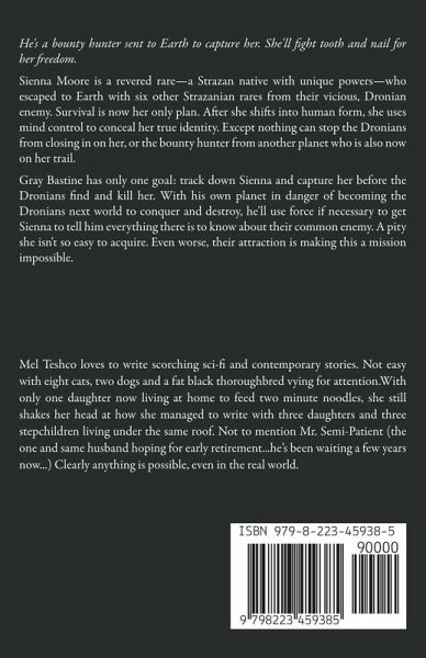 He's a bounty hunter sent to Earth to capture her. She'll fight tooth and nail for her freedom. Sienna Moore is a revered rare—a Strazan native with unique powers—who escaped to Earth with six other Strazanian rares from their vicious, Dronian enemy. Survival is now her only plan. After she shifts into human form, she uses mind control to conceal her true identity. Except, nothing can stop the Dronians from closing in on her, or the bounty hunter from yet another planet who is now also on her trail. Gray Bastine has only one goal: track down Sienna and capture her before the Dronians find and kill her. With his own planet in danger of becoming the Dronians next world to conquer and destroy, he'll use force if necessary to get Sienna to tell him everything there is to know about their common enemy. A pity she isn't so easy to acquire. The longer it takes to claim her, the more he realizes her safety is no less important than those of his own people. Even worse, their attraction is making this a mission impossible.