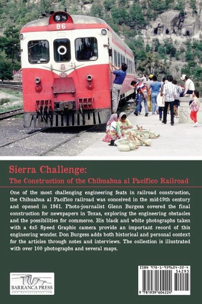 One of the most challenging engineering feats in railroad construction, Mexico's Chihuahua al Pacífico railroad was conceived in the mid-19th century and opened in 1961. Photo-journalist Glenn Burgess covered the final construction for newspapers in Texas, exploring the ¿engineering challenges and the possibilities for commerce. His black and white photographs taken with a 4x5 Speed Graphic camera provide an important record of this engineering wonder. Don Burgess adds both historical and personal context for the articles through notes and interviews. The collection is illustrated with over 100 photographs and several maps. Glenn Burgess worked as a photo-journalist for the El Paso Times and the Fort Worth Star-Telegram. At the time, he also taught journalism and photography at Sul Ross College in Alpine, Texas. Don Burgess, his son, has written numerous books for and about the Tarahumara of Chihuahua, Mexico. He is a linguist/translator and learned photography from Glenn.