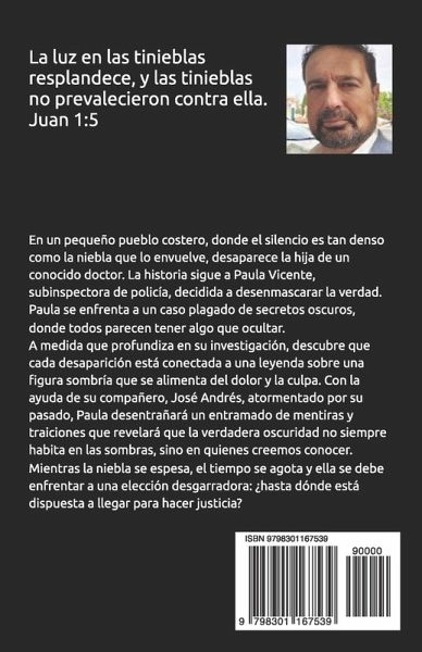 En un pequeño pueblo costero, donde el silencio es tan denso como la niebla que lo envuelve, desaparece la hija de un conocido doctor. La historia sigue a Paula Vicente, subinspectora de policía, decidida a desenmascarar la verdad. Paula se enfrenta a un caso plagado de secretos oscuros, donde todos parecen tener algo que ocultar. A medida que profundiza en su investigación, descubre que cada desaparición está conectada a una leyenda sobre una figura sombría que se alimenta del dolor y la culpa. Con la ayuda de su compañero, José Andrés, atormentado por su pasado, Paula desentrañará un entramado de mentiras y traiciones que revelará que la verdadera oscuridad no siempre habita en las sombras, sino en quienes creemos conocer. Mientras la niebla se espesa, el tiempo se agota y ella se debe enfrentar a una elección desgarradora: ¿hasta dónde está dispuesta a llegar para hacer justicia?