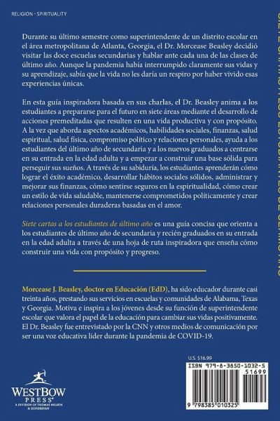 Durante su último semestre como superintendente de un distrito escolar en el área metropolitana de Atlanta, Georgia, el Dr. Morcease Beasley decidió visitar las doce escuelas secundarias y hablar ante cada una de las clases de último año. Aunque la pandemia había interrumpido claramente sus vidas y su aprendizaje, sabía que la vida no les daría un respiro por haber vivido esas experiencias únicas. En esta guía inspiradora basada en sus charlas, el Dr. Beasley anima a los estudiantes a prepararse para el futuro en siete áreas mediante el desarrollo de acciones premeditadas que resulten en una vida productiva y con propósito. A la vez que aborda aspectos académicos, habilidades sociales, finanzas, salud espiritual, salud física, compromiso político y relaciones personales, ayuda a los estudiantes del último año de secundaria y a los nuevos graduados a centrarse en su entrada en la edad adulta y a empezar a construir una base sólida para perseguir sus sueños. A través de su sabiduría, los estudiantes aprenderán cómo lograr el éxito académico, desarrollar hábitos sociales sólidos, administrar y mejorar sus finanzas, cómo sentirse seguros en la espiritualidad, cómo crear un estilo de vida saludable, mantenerse comprometidos políticamente y crear relaciones personales duraderas basadas en el amor. Siete cartas a los estudiantes de último año es una guía concisa que orienta a los estudiantes de último año de secundaria y recién graduados en su entrada en la edad adulta a través de una hoja de ruta inspiradora que enseña cómo construir una vida con propósito y progreso.