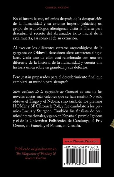 En el futuro lejano, milenios después de la desaparición de la humanidad y su extenso imperio galáctico, un grupo de arqueólogos alienígenas visita la Tierra para descubrir el secreto del abrumador éxito inicial de la raza muerta, así como el de su extinción. Al excavar los diferentes estratos arqueológicos de la garganta de Olduvai, descubren siete artefactos singulares. Cada uno de ellos está relacionado con una era diferente de la historia de la humanidad y cuenta una historia única sobre su grandeza y sus defectos. *** Pero ¿están preparados para el descubrimiento final que cambiará su mundo para siempre? *** Siete visiones de la garganta de Olduvai es una de las novelas cortas más célebres que se han escrito. No solo obtuvo el Hugo y el Nebula, sino también los premios HOMer y SF Chronicle Poll, y fue candidato a los premios Locus y Sturgeon. También fue finalista de pre- mios internacionales, y ganó en España el premio Ignotus y el de la Universitat Politècnica de Catalunya, el Prix Ozone, en Francia y el Futura, en Croacia. ***