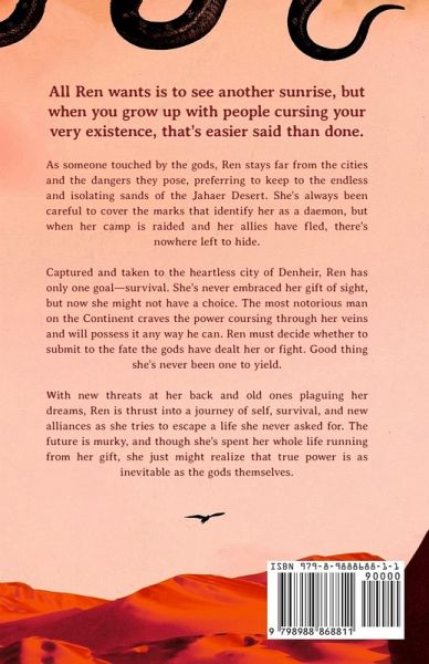 All Ren wants is to see another sunrise, but when you grow up with people cursing your very existence, that's easier said than done. As someone touched by the gods, she keeps far from the cities and the dangers they pose, preferring to keep to the endless and isolating sands of the Jahaer Desert. She's managed to keep the marks that identify her as a daemon out of sight for this long, but when her camp is raided, and her allies have fled, there's nowhere left to hide. Captured and taken to the heartless city of Denheir, Ren has only one goal-survival. She's never embraced her gift of sight, but now she might not have a choice. Face to face with the most notorious man on the Continent and his desire for the power coursing through her veins, Ren must decide: submit to the fate the gods have dealt her or fight. Good thing she's never been one to yield. With new threats at her back and old ones plaguing her dreams, Ren is thrust into a journey of self, survival, and new alliances as she tries to escape a life she never asked for. The future is murky, and though she's spent her whole life running from her gift, she just might realize that true power is as inevitable as the gods themselves.