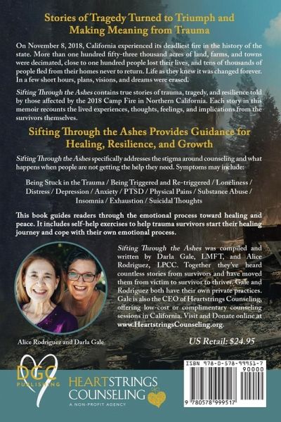 Stories of Tragedy Turned to Triumph and Making Meaning from Trauma On November 8, 2018, California experienced its deadliest fire in the history of the state. More than one hundred fifty-three thousand acres of land, farms, and towns were decimated, close to one hundred people lost their lives, and tens of thousands of people fled from their homes never to return. Life as they knew it was changed forever. In a few short hours, plans, visions and dreams were erased. Sifting Through the Ashes contains true stories of trauma, tragedy, and resilience told by those affected by the 2018 Camp Fire in Northern California. Each story in this memoir recounts the lived experiences, thoughts, feelings, and implications from the survivors themselves. This book is designed to help anyone who has undergone trauma of any kind, devastation, and hopelessness to learn to cope with disaster or grief, written from the perspective of survivors, first responders, and therapists. Though towns are being rebuilt, the trauma of the 2018 Camp Fire echoes in the hearts and minds of those who lived it. Sifting through the Ashes Provides Guidance for Healing, Resilience, and Growth Sifting Through the Ashes specifically addresses the stigma around counseling and what happens when people are not getting the help they need. Symptoms may include the following: Being stuck in the trauma / Remaining a victim / Being triggered and re-triggered / Isolation / Loneliness / Distress / Depressions / Anxiety / Post-Traumatic Stress Disorder / Irritability / Physical pains / Substance abuse / Trouble concentrating / Insomnia / Social isolation / Lack of energy / Exhaustion / Feeling numb or having no feelings / Suicidal thoughts This book guides readers through the emotional process toward healing and peace, fostering and promoting resilience and growth. It also includes a self-help section of practical mental health exercises to help trauma survivors start their healing journey and cope with their own emotional process. Sifting Through the Ashes was compiled and written by Darla Gale, LMFT, and Alice Rodriguez, LPCC. Together they've heard countless stories from survivors and have moved them from victim to survivor to thriver. Gale works for Heartstrings Counseling, where they offer low-cost or complimentary counseling sessions in California. www.HeartstringsCounseling.org All the profits from the sales of Sifting Through the Ashes are being put into the Heartstrings Crisis and Disaster Counseling Program to provide free counseling sessions (California residents only) to trauma survivors.