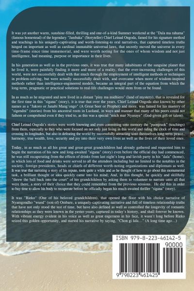 It was yet another warm, sunshine-filled, thrilling and one-of-a-kind Summer weekend at the "Dala ma rahuma" (famous homestead) of the legendary "Jambaka" (Storyteller) Chief Leinad Ongoda, famed for his signature method and teachings in his uniquely-captivating and worth-listening-to oral narratives, that captured timeless truths hinged on important as well as cardinal immutable universal laws, that secretly moved the universe in every time-frame since time immemorial, and were worth noting for the ones of whom wisdom and not just intelligence, had meaning, purpose or importance in their lives. In his generation as well as in the previous ones, it was true that many inhabitants of the sanguine planet that he lived in, were painfully finding it more and more of a reality, that the ever-increasing challenges of this world, were not successfully dealt with that much through the employment of intelligent methods or techniques in problem-solving, but were actually successfully dealt with, and overcame when more of wisdom-inspired methods rather than intelligence-engineered models, became an integral part of the equation from which the long-term, pragmatic or practical solutions to real-life challenges would stem from, or be found. In as much as he migrated and now lived in a distant "piny ma midhiero" (land of mystery) that is revealed for the first time in this "sigana" (story), it is true that over the years, Chief Leinad Ongoda also known by other names as a "Jakoro or Janabi Mang'ongo" (A Great Seer or Prophet) and more, was famed for his mastery of "sigendni" (stories) from his ancestral roots in Luoland, in ways and manner that many of his peers could not fathom or comprehend even if they tried to, as this was a special "mich mar Nyasaye" (God-given gift or talent). Chief Leinad Ongoda's stories were worth knowing and even committing unto memory the "puonjruok" (teachings) from them, especially to they who were focused on not only just living in this world and riding the clock of time and crossing its longitudes, but also in defeating the world by successfully attracting unto themselves long-term peace, harmony, true wealth, love, security and joy into their very own lives as well as in the lives of their loved ones. Today, in as much as all his great and great-great grandchildren had already gathered and requested him to begin the narration of his new and much-awaited "sigana" (story) even before the official day had commenced, he was still recuperating from the effects of drinks from last night's long and lavish party in his "dala" (home), in which lots of food and drinks were served to all the attendees including but not limited to the notables in the society, heads of different worth-noting organizations, and diplomats as well. It was true that narrating a story of his repute, took quite a while and as he thought of how to go about this monumental task, a brilliant idea quickly came into his mind; And, in this thought, he quickly and skillfully "threw the ball back into the court" of his grandchildren by asking them to volunteer to narrate unto all that were there, a story of their choice that they could remember from the previous sessions. He did this in order to buy time to allow his body to recuperate before he officially began his much-awaited thriller "sigana" (story)...