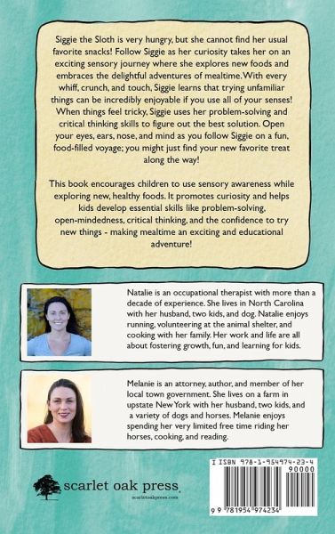 Siggie the Sloth is very hungry, but she cannot find her usual favorite snacks. Follow Siggie as her curiosity takes her on an exciting sensory journey where she explores new foods and embraces the delightful adventures of mealtime. With every whiff, crunch, and touch, Siggie learns that trying unfamiliar things can be incredibly enjoyable if you use all of your senses! When things feel tricky, Siggie uses her problem-solving and critical thinking skills to figure out the best solution. Open your eyes, ears, nose, and mind as your follow Siggie on a fun, food-filled voyage; you might just find your new favorite treat along the way! This book encourages children to use sensory awareness while exploring new, healthy foods. It promotes curiosity and helps kids develop essential skills like problem-solving, open-mindedness, critical thinking, and the confidence to try new things -- making mealtime an exciting and educational adventure!