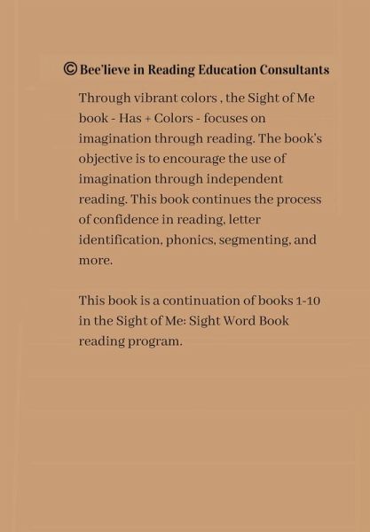 Through vibrant colors, the Sight of Me book - Has + Colors - focuses on imagination through reading. The book's objective is to encourage the use of imagination through independent reading. This book continues the process of confidence in reading, letter identification, phonics, segmenting, and more.