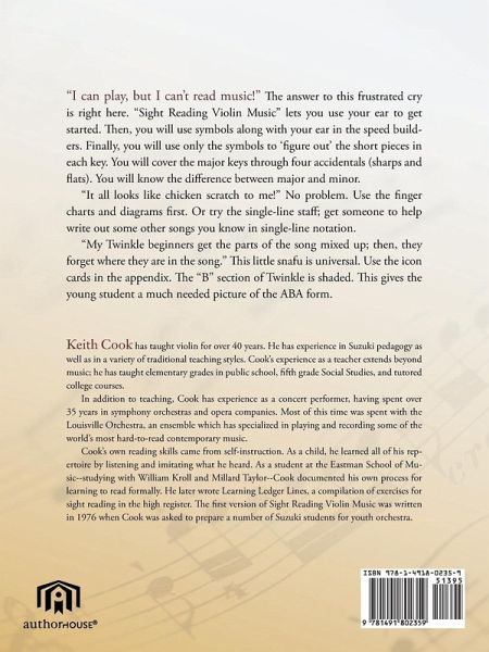"I can play, but I can't read music!" The answer to this frustrated cry is right here. "Sight Reading Violin Music" lets you use your ear to get started. Then, you will use symbols along with your ear in the speed builders. Finally, you will use only the symbols to 'figure out' the short pieces in each key. You will cover the major keys through four accidentals (sharps and flats). You will know the difference between major and minor. "It all looks like chicken scratch to me!" No problem. Use the finger charts and diagrams first. Or try the single-line staff; get someone to help write out some other songs you know in single-line notation. "My Twinkle beginners get the parts of the song mixed up; then, they forget where they are in the song." This little snafu is universal. Use the icon cards in the appendix. The "B" section of Twinkle is shaded. This gives the young student a much needed picture of the ABA form.