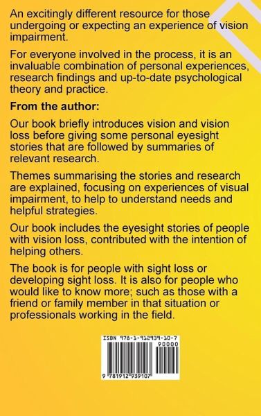 An excitingly different resource for those undergoing or expecting an experience of vision impairment. For everyone involved in the process, it is an invaluable combination of personal experiences, research findings and up-to-date psychological theory and practice. The book briefly introduces vision and vision loss before giving some personal eyesight stories that are followed by summaries of relevant research. Themes summarising the stories and research are explained, focusing on experiences of visual impairment, to help to understand needs and helpful strategies. This book includes the eyesight stories of people with vision loss, contributed with the intention of helping others. The book is for people with sight loss or developing sight loss. It is also for people who would like to know more; such as those with a friend or family member in that situation or professionals working in the field.
