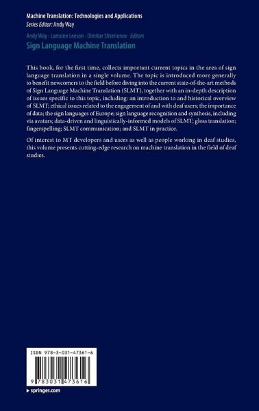 This book, for the first time, collects important current topics in the area of sign language translation in a single volume. The topic is introduced more generally to benefit newcomers to the field before diving into the current state-of-the-art methods of Sign Language Machine Translation (SLMT), together with an in-depth description of issues specific to this topic, including: an introduction to and historical overview of SLMT; ethical issues related to the engagement of and with deaf users; the importance of data; the sign languages of Europe; sign language recognition and synthesis, including via avatars; data-driven and linguistically-informed models of SLMT; gloss translation; fingerspelling; SLMT communication; and SLMT in practice.