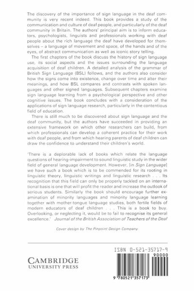 Acknowledgements Introduction 1. The deaf community 2. British Sign Language 3. Historical aspects of BSL 4. Sign language acquisition 5. The building blocks of sign language 6. The structure of signs 7. Sign morphology and syntax: the grammar of BSL 8. Comparing sign languages 9. Learning and using BSL 10. The psychology of sign 11. Sign language interpreting 12. Sign language in schools 13. Which sign language? 14. Developments for sign language Appendix References Subject index Index of signs in the text Index of names in the text.