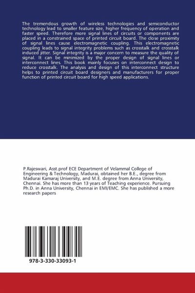 The tremendous growth of wireless technologies and semiconductor technology lead to smaller feature size, higher frequency of operation and faster speed. Therefore more signal lines of circuits or components are placed in a constrained space of printed circuit board. The close proximity of signal lines cause electromagnetic coupling. This electromagnetic coupling leads to signal integrity problems such as crosstalk and crosstalk induced jitter. Signal integrity is a major concern to measure the quality of signal. It can be minimized by the proper design of signal lines or interconnect lines. This book mainly focuses on interconnect design to reduce crosstalk. The analysis and design of this interconnect structure helps to printed circuit board designers and manufacturers for proper function of printed circuit board for high speed applications.