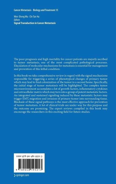 The poor prognosis and high mortality for cancer patients are majorly ascribed to tumor metastasis, one of the most complicated pathological processes. Elucidation of molecular mechanisms for metastasis is essential for management and prevention of this lethal condition. In the book to be published, we take comprehensive review in regard with the signal mechanisms responsible for triggering a series of phenotypical changes of primary tumor which may lead to final colonization of the tumor in a second home. Specifically, the initial stage of tumor metastasis will be highlighted. The complex tumor microenvironment accumulate a lot of growth factors, inflammatory cytokines and extracellular matrix which may turn into a group of potent metastatic factors. An integrated and sustained signaling induced by these metastatic factors may trigger EMT, migration and invasion of primary tumor into surround tissue. Blokcade of these signal pathways is the most effective approach for prevention of tumor metastasis. A lot of clinical trials are under way for this purpose and the outcome are promising. The expert reviews compiled in this book may encourage the researcher in this exciting field for future study.