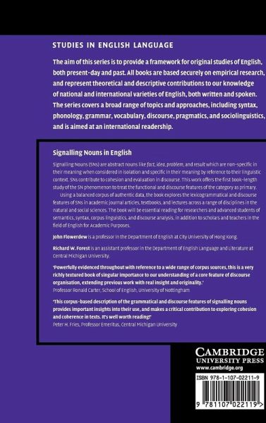 Signalling nouns (SNs) are abstract nouns like 'fact', 'idea', 'problem' and 'result', which are non-specific in their meaning when considered in isolation and specific in their meaning by reference to their linguistic context. SNs contribute to cohesion and evaluation in discourse. This work offers the first book-length study of the SN phenomenon to treat the functional and discourse features of the category as primary. Using a balanced corpus of authentic data, the book explores the lexicogrammatical and discourse features of SNs in academic journal articles, textbooks, and lectures across a range of disciplines in the natural and social sciences. The book will be essential reading for researchers and advanced students of semantics, syntax, corpus linguistics and discourse analysis, in addition to scholars and teachers in the field of English for academic purposes.
