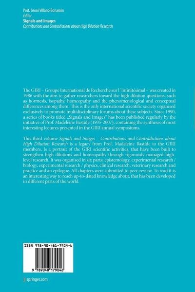 The "Groupe International de Recherche sur l'Infinitésimal" (GIRI) was created in 1986 by Professor Madeleine Bastide and Doctor René Halm. Madeleine Bastide was its President for several years. The group comprises actually more than 100 researchers from different disciplines (physicians, chemists, biologists, pharmacologists, physicists, etc. ) from 22 different countries. The original aim, which, for the most part, has now been achieved, was to create a working group to exchange ideas and results concerning the effects of very low doses and high dilutions. Madeleine Bastide then proposed to publish a collection of the lectures given at their scientific meetings in a bilingual book (French and English) entitled "Signals and Images". The first volume was published in 1990 by the ATELIERS ALPHA BLEUE. It contains lectures on the new pharmacological approach and related concepts that were presented at the 3rd and 4th Symposiums held in Paris in 1989 and 1990. This volume treats theproblem of the effects of very low doses and high dilution in in vitro and in vivo experimental models. It is conceivable that this effect, like that of elect- magnetic fields, is none other than an "ultra molecular" effect as shown in yet p- lished results. The effect could be interpreted as a piece of information, i. e. a signal whose transmission and perception remains to be elucidated. According to Madeleine Bastide "everything depends on the nature and quality of the information, signals and images".