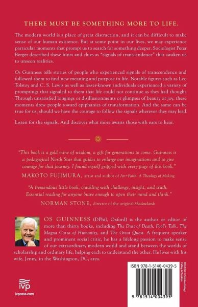 There must be something more to life. The modern world is a place of great distraction, and it can be difficult to make sense of our human existence. But at some point in our lives, we may experience particular moments that prompt us to search for something deeper. Sociologist Peter Berger described these hints and clues as "signals of transcendence" that awaken us to unseen realities. In Signals of Transcendence Os GuinnessTells stories of people who experienced signals of transcendence and followed them to find new meaning and purpose in life, Explores the experiences of notable figures such as Leo Tolstoy and C. S. Lewis as well as lesser-known individuals who experienced a variety of promptings that signaled to them that life could not continue as they had thought, and Shows how we can experience the same kinds of moments of transcendence if only we open our eyes to recognize the signals. Through unsatisfied longings or disillusionments that yet yielded glimpses of beauty or joy, these moments drew people toward epiphanies of transformation. And the same can be true for us, should we have the courage to follow the signals wherever they may lead. Listen for the signals. And discover what more awaits those with ears to hear.