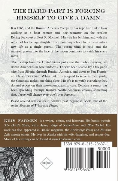 It is 1865, and the Russian America Company has kept Ivan Lukin busy working as a boat captain and dog teamster on the treeless Bering Sea coast at Fort St. Michael. His wife has left him, and with the return of his teenage daughter from boarding school he is thrust into a new life as a single parent. The ocean wind is cold and the monster graven into the face of the moon continues to watch his every move. Then a ship from the United States pulls into the harbor carrying two dozen Americans in blue uniforms. They've been sent to lay a telegraph wire from Siberia, through Russian America, and down to San Francisco. Or so they claim. When Lukin is assigned to serve as their guide, the Company makes one thing clear: His job is to watch everything they do and report on their movements, just in case. Because a rumor has been spreading through Russia's North American colony, something that, if true, will change everyone's lives forever. Based around real events in Alaska's past, Signals is Book Two of the series Seasons of Want and Plenty.
