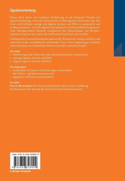 Dieses Buch bietet eine fundierte Einführung in die klassische Theorie der Signalverarbeitung, wobei der Schwerpunkt auf den digitalen Methoden liegt. Der Leser wird befähigt, analoge und digitale Systeme und Filter zu analysieren und zu dimensionieren. Auch die digitale Spektralanalyse wird ausführlich besprochen. Viele durchgerechnete Beispiele ermöglichen das Selbststudium, mit Rechnerunterstützung lässt sich zudem der Stoff veranschaulichen und vertiefen.Umfangreiche Zusatzinformationen sind auf der Webseite des Verlags erhältlich und unterstützen den autodidaktisch arbeitenden Leser. Diese Ergänzungen umfassen weitere Beispiele zur behandelten Materie sowie drei zusätzliche Kapitel.