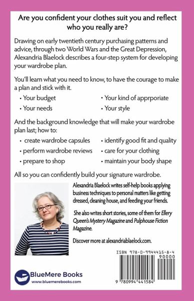 Are you confident that your clothes suit you and reflect who you really are?Drawing on early twentieth century purchasing patterns and advice, through two World Wars and the Great Depression, Alexandria Blaelock describes a four-step system for developing your wardrobe plan. You'll learn what you need to know, to have the courage to make a plan and stick with it.Your budget What's appropriate Your style What you need And the background knowledge that will make your wardrobe plan last; how to:create wardrobe capsules perform wardrobe reviews prepare to shop identify good fit and quality care for your clothing maintain your body shape All so that you can confidently build your signature wardrobe.