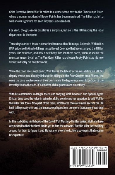 The bestselling David Wolf mystery thriller series races onward, with a harrowing tale that brings Wolf to the Four Corners region to catch a calculating killer. Chief Detective David Wolf is called to a crime scene next to the Chautauqua River, where a woman resident of Rocky Points has been murdered. The killer has left a well-known signature not seen for years--a severed ear. For Wolf, the gruesome display is a surprise, but so is the FBI beating the local department to the scene. While the town reels with panic, Wolf learns the latest victim was dating an SBCSD deputy whose past directly links to similar killings in the Four Corners area. Worse, the FBI has more secrets they're not telling, only adding to the mounting questions about how to catch this calculating, ruthless murderer. In this nail-biting ninth book of the David Wolf Mystery-Thriller series, Wolf and special agent Kristen Luke will be pushed to their furthest limits yet to find answers. But the killer isn't waiting around for them to figure it out. He has more work to do, more payments that require his signature.